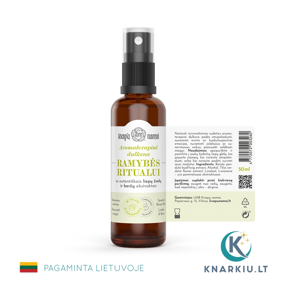 Ši minimalistinės sudėties aromaterapinė dulksna sukurta atsipalaidavimo ritualams ir ramesnei aplinkai. Kompozicijoje naudojamas gaivus lietuviškų beržų pumpurų hidrolatas ir medumi dvelkiantis liepų žiedų ekstraktas.