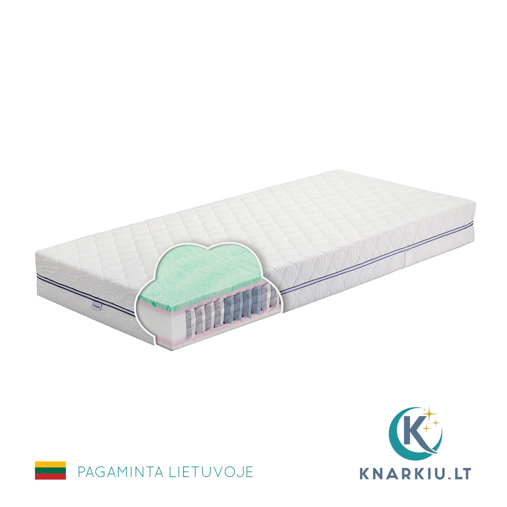 7 minkštumo zonų Pocket spyruoklių blokas ,Clima lateksas ,Padidinto elastingumo putų poliuretanas HR (T-35 kg/m³) ,Viskoelastinė medžiaga BIO green (T-50kg/ m³) |