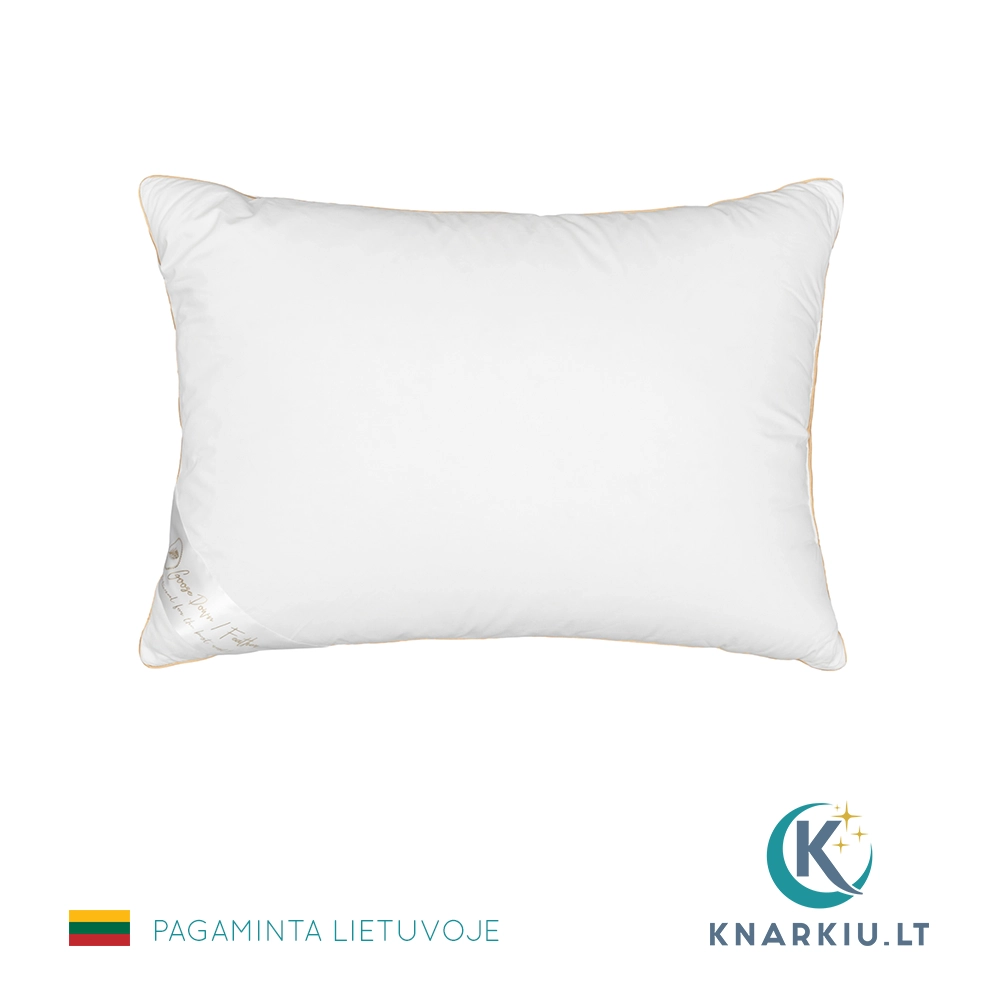 Pagalvė pasiūta iš 100% medvilninio satino, o užpildas sudarytas iš kruopščiai atrinktų žąsų pūkų ir plunksnų, užtikrinančių ilgaamžiškumą, oro pralaidumą ir nepriekaištingą miego pojūtį.